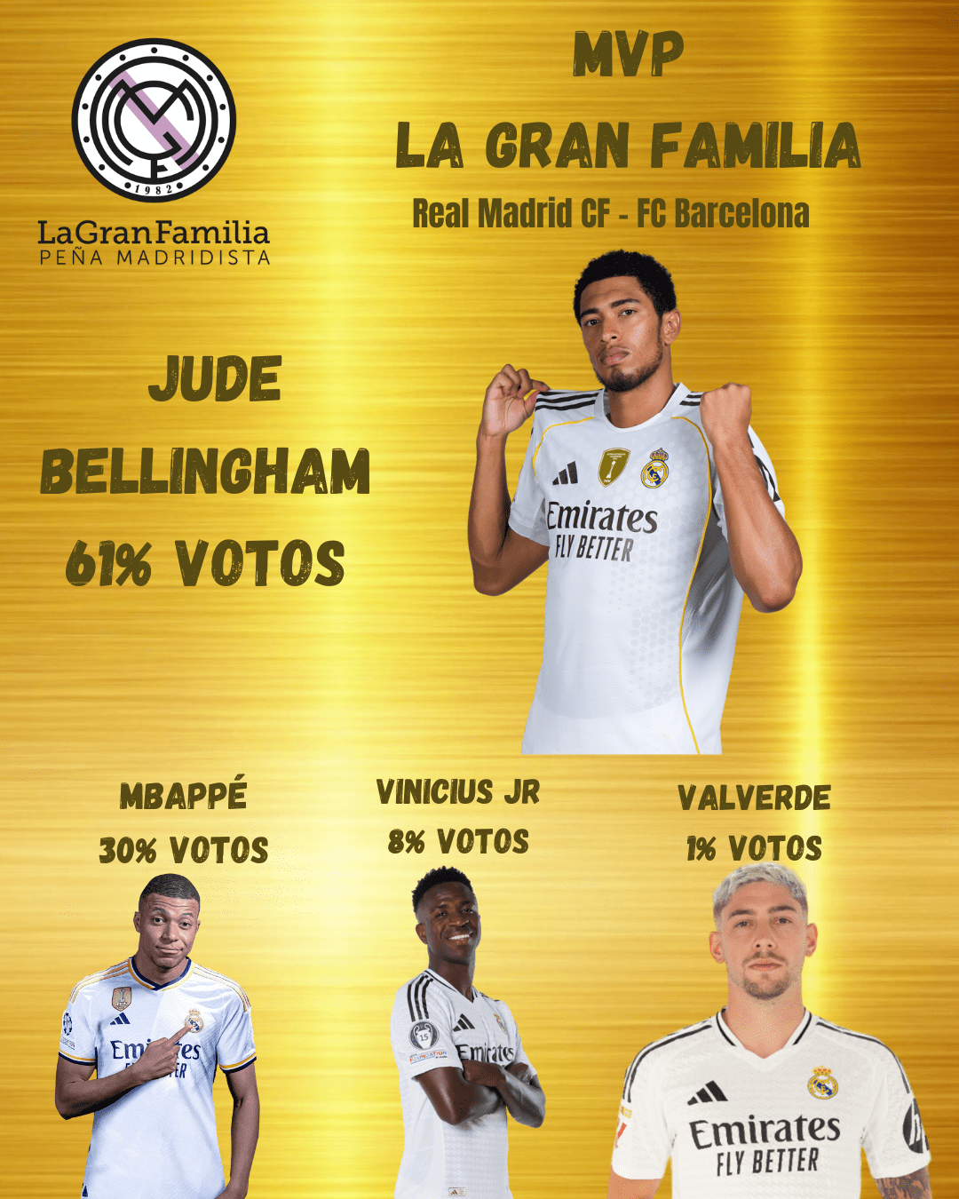 El Bernabéu estaba a reventar para apoyar al equipo en su partido frente al Barcelona. Había que vencer para dar un golpe sobre la mesa y poner tierra de por medio en la clasificación respecto a los culés. Y con goles de Mbappé y Bellingham lo hizo. Tras el partido os dimos la opción de elegir entre Mbappé, Vinicius, Bellingham y Valverde para elegir el MVP madridista, siendo el inglés el elegido por vosotros con un 61% de los votos, seguido de Mbappé 30%, Vinícius 8% y Valverde 1%.