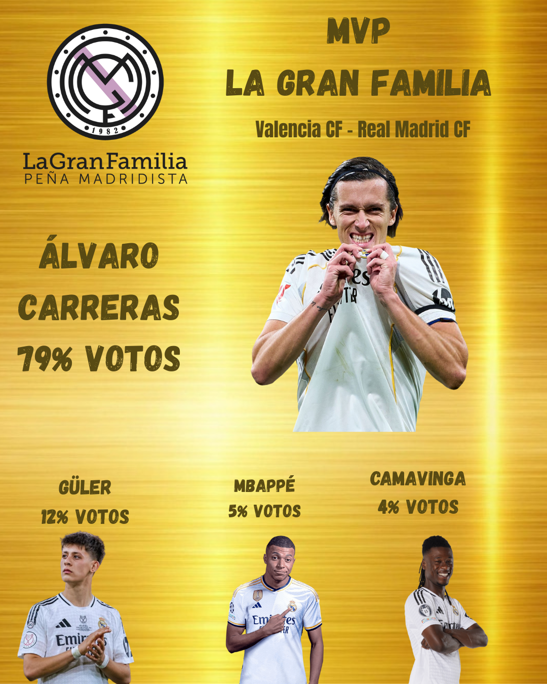 El Madrid logró vencer en Mestalla y sigue a tan sólo un punto del líder. Tras el partido os dimos la opción de elegir entre Mbappé, Camavinga, Carreras y Güler para el MVP madridista, siendo Álvaro Carreras el elegido con un 79% de los votos, seguido de Güler 12%, Mbappé 5% y Camavinga 4%.