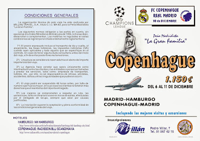 Esperando una buena oferta para ir a Turín en el día, os mando la posibilidad de visitar Copenhague para ver “in situ” a nuestro Real Madrid, desde el desplazamiento que hicimos a Odense, por el año 90 no hemos vuelto a Dinamarca, por lo que hemos creído oportuno estar seis días, para disfrutar de una parte importante de Escandinavia. A esto hay que añadir tres factores que hacen el desplazamiento más interesante, el primero es que aprovechando el puente de la Constitución solo perderemos tres días de trabajo, el segundo que para esas fechas ya están puestos los Mercadillos de Navidad en Alemania y Hamburgo es una de las ciudades que más fama tienen en ese sentido y por último, me parece imposible no ver muchos paisajes nevados en el norte de Europa en esas fechas.
